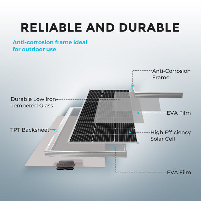 The panel’s bypass diode ensures optimal low-light performance, and the TPT back sheet efficiently removes extra heat so that output remains steady. The maximum efficiency of a module is 17.8%. This kit can be used with the Rover Li 60A MPPT charge controller to handle higher power requirements by adding more solar panels. For example, it supports expansion up to 800W for 12V systems and 1600W for 24V systems.