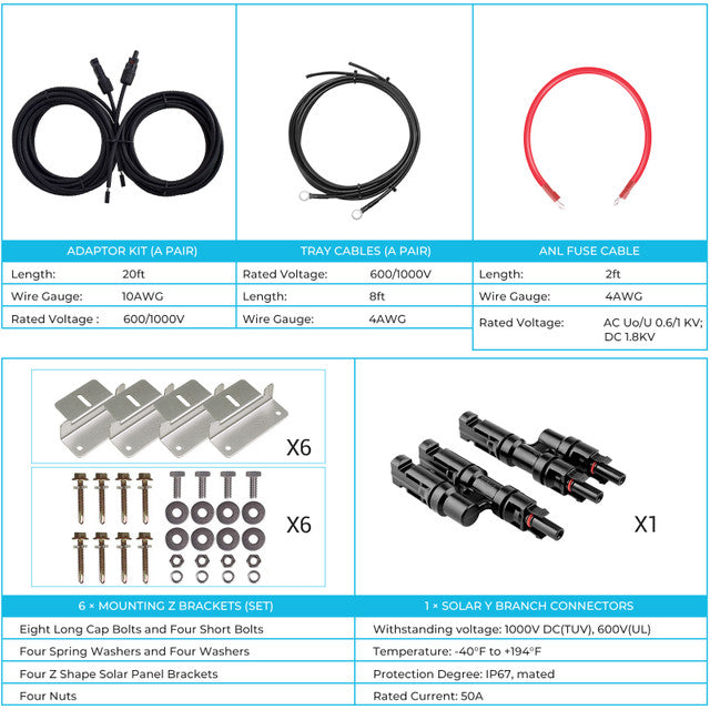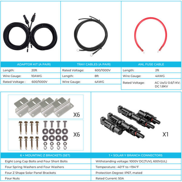 •    Full kit including 100W solar panel, 60A MPPT solar charge controller, a pair of 8Ft tray cables, 2Ft 4AWG fuse cable, a pair of 20Ft 10AWG solar adaptor kit, 15A in-line fuse holder, 60A fuse set, Bluetooth module, solar Y branch connectors, and Mounting brackets