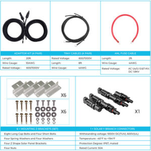 • Full kit including 100W solar panel, 60A MPPT solar charge controller, a pair of 8Ft tray cables, 2Ft 4AWG fuse cable, a pair of 20Ft 10AWG solar adaptor kit, 15A in-line fuse holder, 60A fuse set, Bluetooth module, solar Y branch connectors, and Mounting brackets