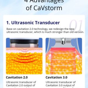 • New Ultrasonic Transducer: Redesigned from cavitation 2.0 technology, the new ultrasonic transducer provides significantly stronger performance than its predecessor. Unlike Cavitation 2.0’s power output in one point, Cavitation 3.0 covers all transducers with its enhanced power output.
