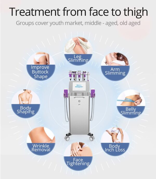 Experience comprehensive body transformation with our advanced 6-in-1 Body Slimming Device. This multifunctional system incorporates Cavitation technology, which efficiently breaks down fat cells for effective weight and cellulite reduction. The Radio Frequency (RF) feature stimulates collagen production, enhancing skin elasticity and firmness. Additionally, the integrated Lipo Laser emits low-level laser energy, promoting targeted fat loss and improved metabolism. Achieve remarkable results, including sculpted contours, tightened skin, and enhanced overall well-being through the synergistic benefits of Cavitation, RF, and Lipo Laser technologies.